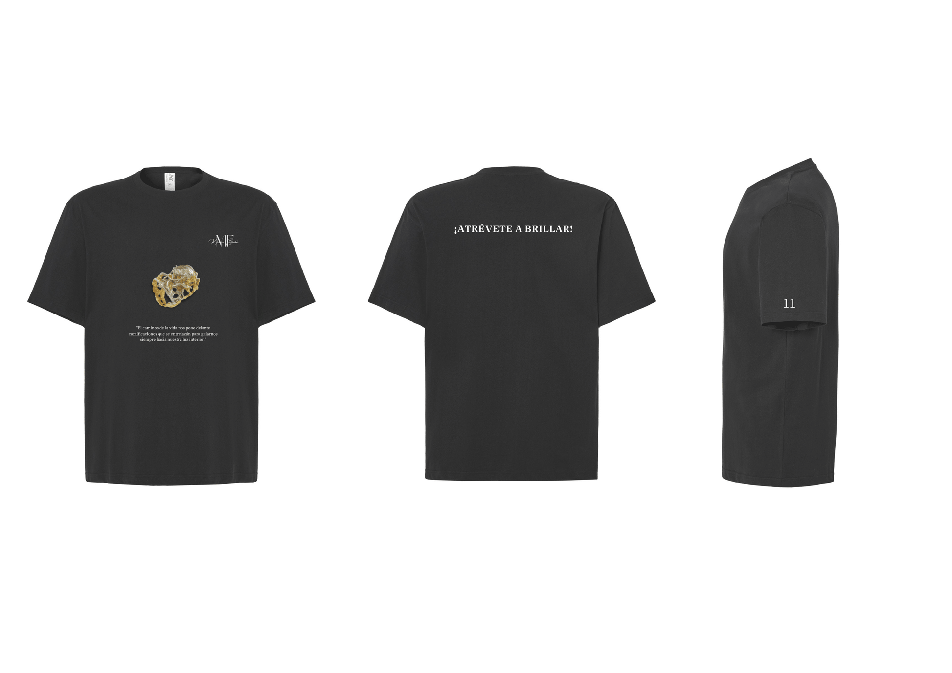 La joya en la camiseta tiene una simbología muy poderosa y es una joya real hecha en ORO 18 KT y un aguamarina.