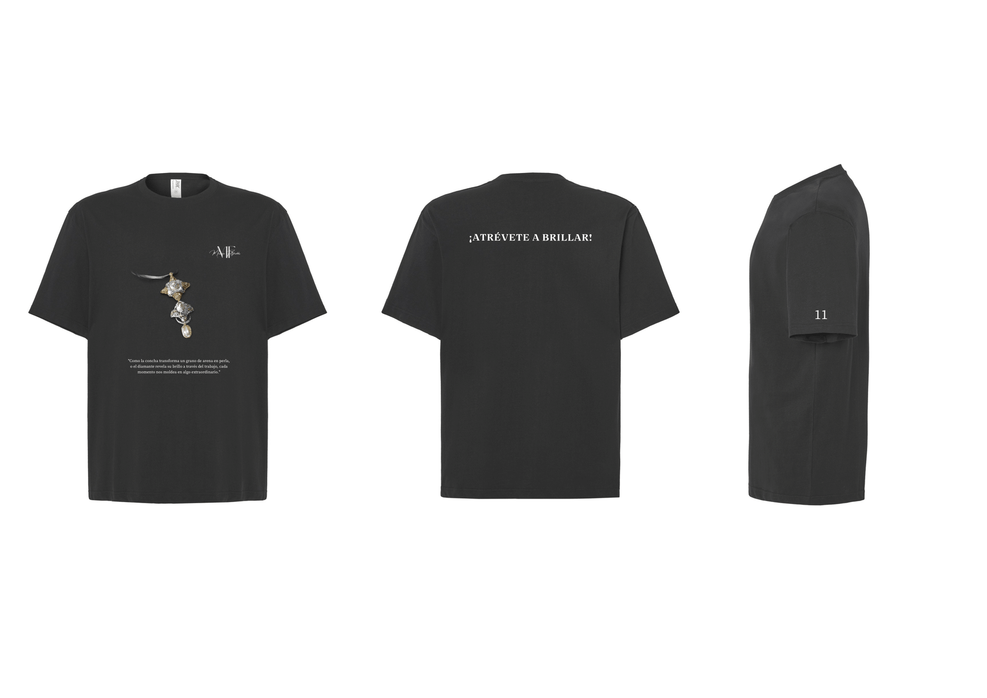 La joya en la camiseta tiene una simbología muy poderosa y es una joya real hecha en ORO 18 KT, diamantes y perlas.