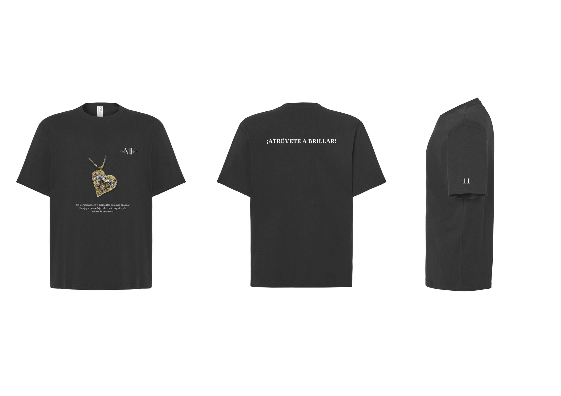 La joya en la camiseta tiene una simbología muy poderosa y es una joya real hecha en ORO 18 KT y diamantes.