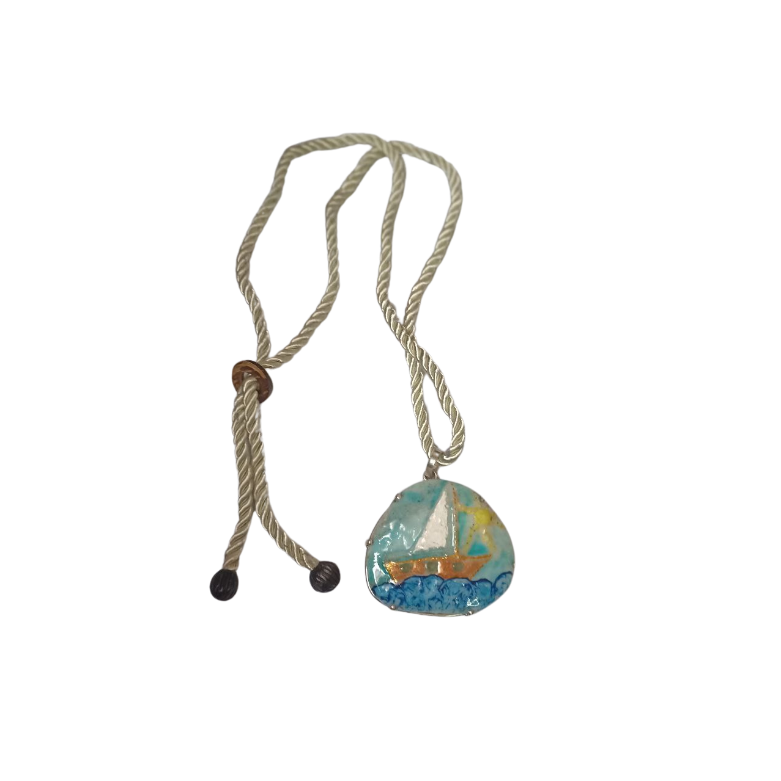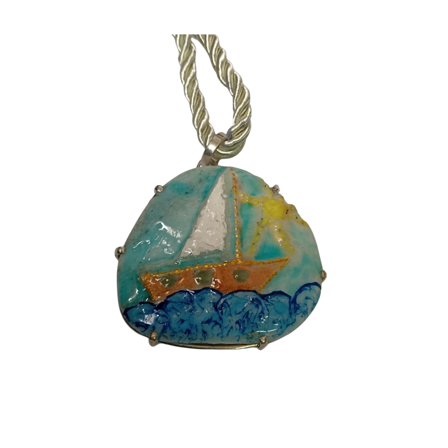 Un colgante único, tallado en una piedra de Andalusia, Costa del Sol. Acabado con resina y engastado en plata de ley 925.